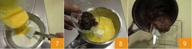 depois despeje tudo dentro da panela com o leite 7. Adicione a manteiga e o chocolate amargo picado 8, leve a mistura de volta ao fogo e deixe engrossar em fogo baixo mexendo sempre. Transfira o creme para um refratário 9,