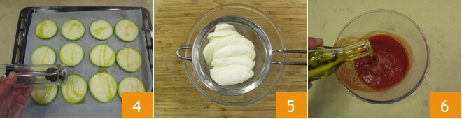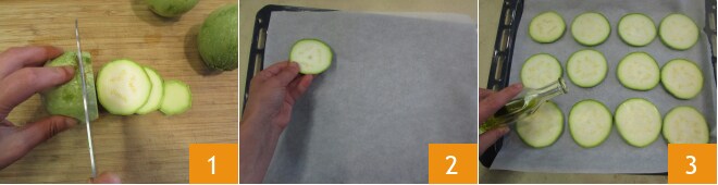 Para preparar as mini pizzas de abobrinha, corte-as em fatias de 1 cm 1 e vá as dispondo sobre uma folha de papel manteiga colocada na assadeira 2. Tempere com um fio de azeite 3.