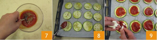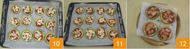 Misture 7 e, quando as abobrinhas estiverem pré-cozidas, decore-as deixando a borda descoberta 8. Rasgue a muçarela com as mãos e coloque sobre as abobrinhas 9.
