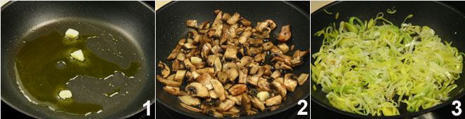 Para preparar as mini quiches com cogumelos, alho-poró e presunto cozido, comece limpando e cortando os champignons em pedaços; doure um dente de alho em uma frigideira antiaderente com duas colheres de sopa de óleo 1 e cozinhe os cogumelos em pedaços 2, sal e pimenta a gosto. Enquanto isso, em outra frigideira com uma colher de sopa de óleo, cozinhe o alho-poró limpo e cortado em fatias finas por cerca de 15/20 minutos 3