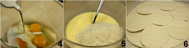 Em uma tigela, bata 4 ovos com o creme de leite 4, mexendo bem e incorpore o Grana Padano 5, ajuste o sal e a pimenta. Unte com manteiga 14 forminhas de forno com cerca de 8 cm de diâmetro, ou formas de muffin (neste caso, as mini quiches ficarão ainda menores) e corte a massa folhada em círculos com um diâmetro cerca de dois centímetros maior do que suas forminhas, usando um copo ou uma tigela pequena 6.