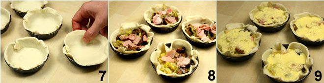 Finalmente, forre as formas com os discos de massa folhada 7 e comece a recheá-los. Adicione em cada quiche a mistura de champignons e alho-poró, o presunto cozido cortado em pedaços pequenos 8 e despeje por cima o líquido de ovos, creme de leite e Grana Padano até preenchê-los 9. As quiches devem ser assadas a 180°C (forno ventilado) por cerca de 20 minutos, até que fiquem com uma bela aparência dourada. Sirva as mini quiches com cogumelos, alho-poró e presunto bem quentes!