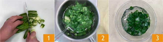 Para preparar os mini strudel com acelga, ricota e speck, a primeira coisa a fazer é o recheio: lave as acelgas e corte-as em pedaços 1. Cozinhe em água fervente com sal por 5 minutos, depois escorra 2 e resfrie em água com gelo 3.