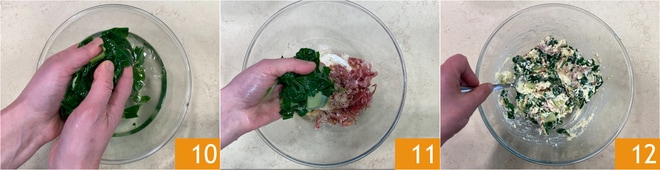 Escorra e esprema bem as acelgas 10, depois coloque-as na tigela 11. Misture para integrar os ingredientes 12.