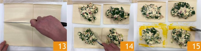 Corte a massa folhada em 4 retângulos de aproximadamente 10x15 cm 13. Coloque um pouco de recheio no centro dos retângulos 14, depois pincele as bordas com uma gema batida 15.