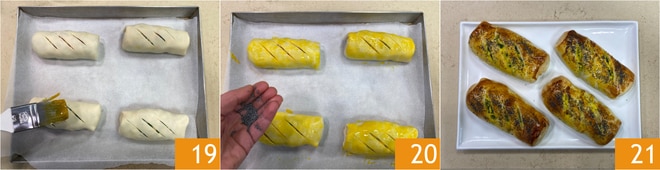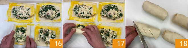 Dobre as bordas curtas para dentro 16, depois enrole 17 certificando-se de selar bem as extremidades. Faça cortes na superfície dos rolinhos 18.