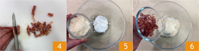 Corte o speck em tiras 4. Em uma tigela, coloque a ricota e depois adicione o Parmesão 5 e o speck 6.