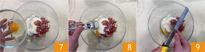 Adicione o ovo 7 e tempere com sal, pimenta 8 e uma pitada de noz-moscada 9.
