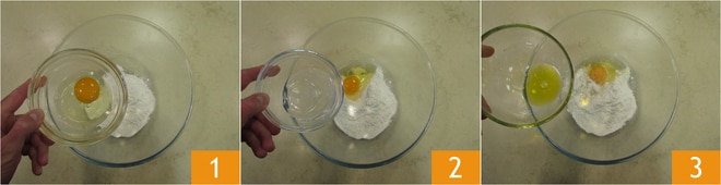 Para preparar os Mini strudels salgados com alcachofras, batatas e speck, comece pela massa do strudel: em uma tigela coloque a farinha, o ovo 1, a água 2, o óleo 3 e uma pitada de sal.
