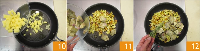 Adicione as batatas 10 e cozinhe por 5 minutos. Depois, acrescente também as alcachofras 11 e tempere com o alecrim 12.