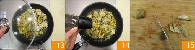 Cubra com a tampa 13 e cozinhe por 10 minutos em fogo baixo. Salgue e apimente 14. Fatie finamente as alcachofras 15.