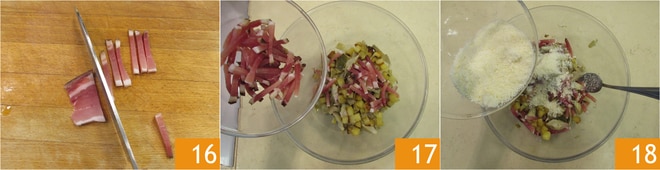 Corte o speck em tiras 16. Em uma tigela, coloque os vegetais salteados, o speck 17 e o queijo ralado 18.