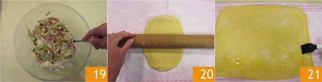 Misture para combinar 19. Abra a massa sobre um pano de prato primeiro com um rolo e depois usando as mãos para esticá-la bem fina 20. Pincele a superfície com óleo 21.