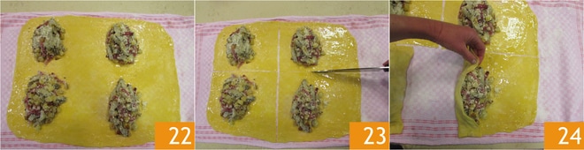 Coloque o recheio nos 4 lados 22, então corte 4 retângulos ao redor do recheio 23. Dobre uma borda da massa 24.
