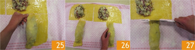 Até envolver todo o recheio 25, para criar um pacotinho 26. Corte o excesso de massa na borda e pressione para selar 27.