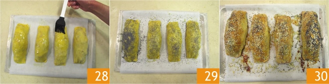 Pincele a superfície com óleo e polvilhe com sementes de gergelim e papoula. Asse em forno estático pré-aquecido a 200° por 20 minutos ou até dourar. Retire do forno e deixe esfriar um pouco antes de servir os Mini strudels salgados com alcachofras, batatas e speck.