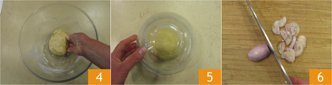 Sove à mão até obter uma massa homogênea 4, depois transfira para a bancada, cubra com a mesma tigela e deixe descansar por 30 minutos em temperatura ambiente 5. Limpe e fatie a cebola echalota 6.