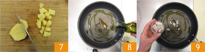 Descasque e corte em pequenos cubos de 1 cm as batatas 7. Em uma frigideira, coloque um fio de óleo 8, adicione a cebola echalota 9 e deixe refogar por 2/3 minutos.