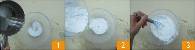 Para preparar os mochi, primeiro aqueça a água em uma panela e despeje-a fervente sobre o açúcar 1. Adicione a farinha de arroz 2 e misture com um batedor 3.