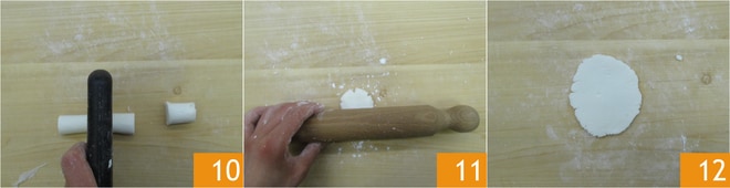 Faça pequenos pedaços 10. Estenda a massa com um rolo 11 para criar pequenos discos 12.