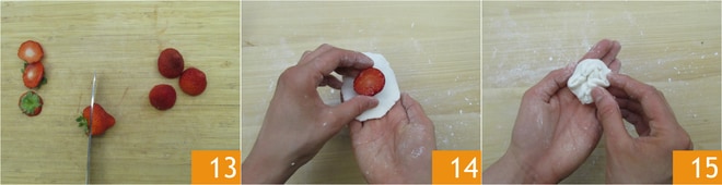 Lave e seque os morangos, depois retire o talo 13. Envolva o morango com o disco de massa 14 e feche a extremidade 15.