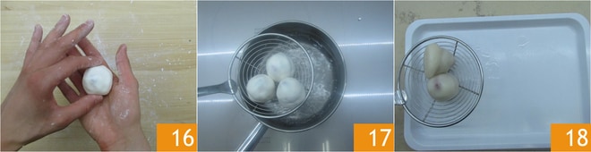 Você deve obter uma espécie de cone que reproduz a forma do morango 16. Ferva os Mochi 17 por alguns minutos até subirem à superfície 18.