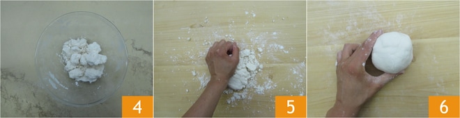 Uma vez reunidos os ingredientes 4, transfira a massa para uma superfície de trabalho e amasse 5 até formar um bloco homogêneo 6.
