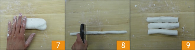 Retome o bloco de massa e estenda-o 7 para formar rolos, cortando-os em pedaços menores 8 9.