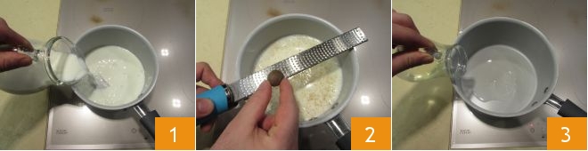Para preparar o molho branco sem manteiga, primeiro coloque o leite em uma panela 1 e leve-o quase à fervura, adicionando uma pitada de sal e uma pitada de noz-moscada 2. Enquanto isso, coloque o óleo vegetal em outra panela e deixe aquecer em fogo baixo