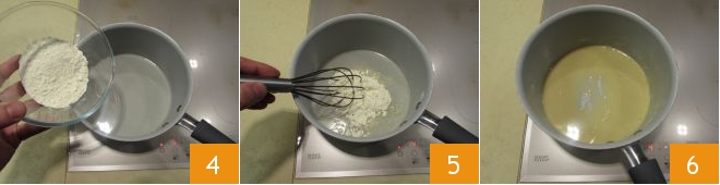depois, ao óleo aquecido, adicione a farinha em chuva 4, mexendo rapidamente com um batedor para evitar que se formem grumos 5. Deixe o composto dourar 6,