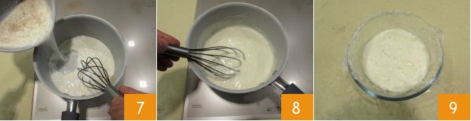 em seguida, junte ao composto de farinha e óleo o leite já quente 7 e continue cozinhando, mexendo constantemente com o batedor 8 até começar a ferver. Uma vez atingida a densidade desejada, transfira seu molho branco sem manteiga para uma tigelinha e cubra com filme plástico em contato 9 até o momento de usar!