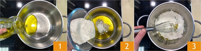 Para preparar o molho branco vegano, como primeiro passo aqueça o leite de aveia até quase ferver. Despeje o azeite extra virgem em uma panelinha 1, junte a farinha 2 e mexa com um batedor 3 até obter uma mistura lisa e sem grumos.