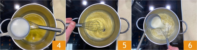 Ligue o fogo em chama média e cozinhe por 1-2 minutos para criar o clássico roux. Depois despeje o leite quente uma concha de cada vez 4, mexendo sempre com o batedor 5. Continue rapidamente assim até terminar o leite 6.