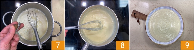 Tempere com noz-moscada 7 e sal e leve à fervura. Mexa até obter a consistência desejada 8, depois desligue o fogo e transfira para uma tigela 9. Seu molho branco vegano está pronto para ser usado!