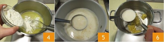 Quando estiver derretido, adicione a farinha aos poucos 4 e misture rapidamente com um batedor até obter um roux cor de avelã. Assim que o leite estiver quente, retire uma concha 5 e despeje dentro do roux, continuando a mexer continuamente 6.