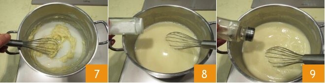 Adicione o leite quente aos poucos 7 até terminar. Em seguida, ajuste o sal 8 e a pimenta 9.