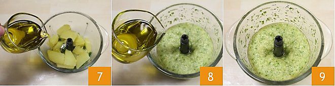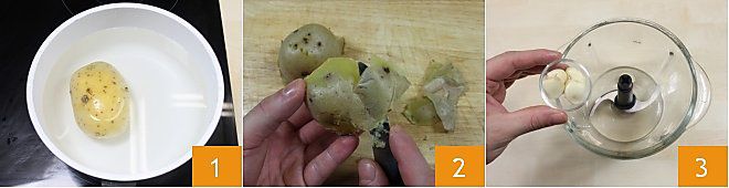 Para preparar o molho de alho, lave bem a batata e coloque para cozinhar com casca em água salgada 1; quando estiver cozida (fure com um garfo para verificar o cozimento), escorra e deixe esfriar. Uma vez fria, descasque 2 e corte em pedaços. Descasque o alho e coloque no processador 3 (se preferir, pode usar um pilão)