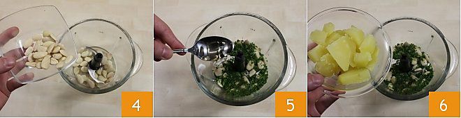 adicione as amêndoas descascadas 4, o salsinha, o vinagre 5, as batatas 6,