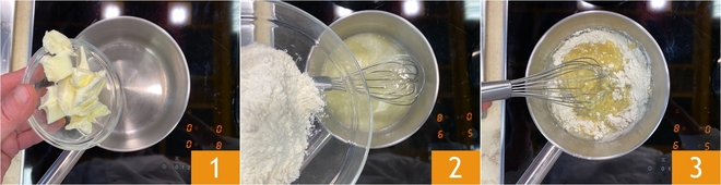 Para preparar o molho gravy, primeiro faça o Caldo de carne com a nossa receita. Quando o caldo estiver pronto, coloque a manteiga em uma pequena panela e deixe derreter lentamente em fogo baixo 1, para obter uma base lisa e uniforme. Quando a manteiga estiver completamente derretida, adicione a farinha 2 e mexa imediatamente com o batedor para criar o roux 3.