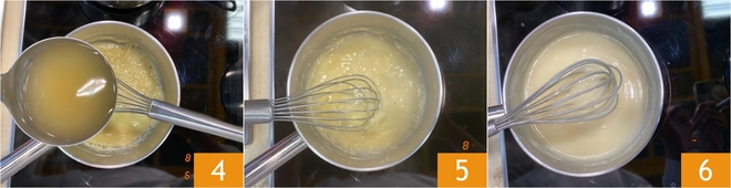 Continue mexendo no fogo, sempre misturando, até que comece a escurecer ligeiramente e ganhar uma cor de avelã. Neste ponto, incorpore o caldo de carne quente, pouco a pouco 4, despejando-o em fio enquanto continua a mexer vigorosamente para evitar a formação de grumos 5. Você verá que, à medida que adiciona o caldo, o molho começará a engrossar como um bechamel, tornando-se macio e brilhante. Continue cozinhando até obter um creme aveludado e uniforme 6.