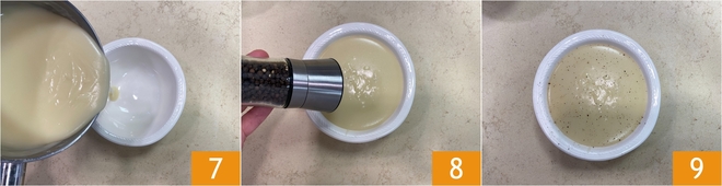 Quando o molho atingir a consistência desejada, transfira-o para uma tigela resistente ao calor para servir 7. Agora você pode ajustar o sal, se o caldo não estiver já salgado, e adicionar uma generosa pitada de pimenta-do-reino para realçar o sabor do molho 8. Mexa novamente e o seu molho gravy está pronto: quente, perfumado e envolvente 9.