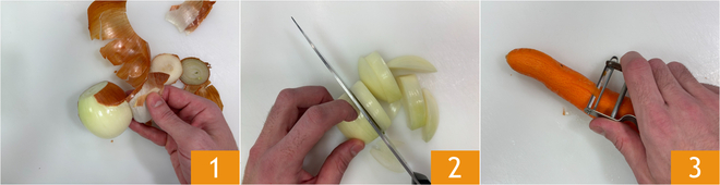 Para preparar o molho para assado, comece preparando o Caldo de carne e mantenha-o aquecido. Descasque as cebolas 1 e corte-as em fatias 2. Descasque as cenouras 3.