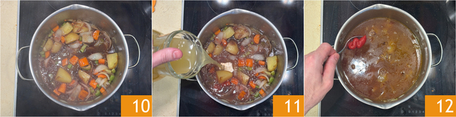 Deixe evaporar completamente 10, depois adicione o caldo de carne 11 e o extrato de tomate 12.