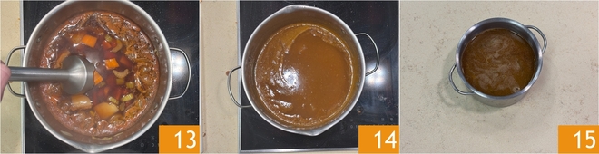 Cozinhe em fogo baixo por uma hora. Como utilizamos o caldo ligeiramente salgado, preferimos não adicionar sal. Uma vez pronto, bata tudo com um mixer de mão 13 até obter uma mistura sedosa e cremosa; deixe engrossar por mais 10 minutos em fogo baixo, mexendo de vez em quando 14 e ajuste o sal, se necessário. Seu molho para assado está pronto para ser servido 15!