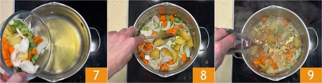 Em uma panela, aqueça um fio de óleo e adicione os vegetais 7. Misture 8 e deixe dourar em fogo médio por cerca de 5 minutos. Refogue com o vinho tinto 9.