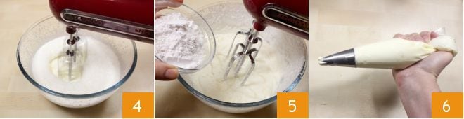 bata tudo com uma batedeira elétrica 4; levará cerca de dez minutos porque a presença das bebidas alcoólicas exigirá mais tempo para obter uma montagem perfeita. tenha em mente que levará mais tempo do que o previsto. Adicione o açúcar de confeiteiro 5, misture e transfira a espuma obtida para um saco de confeitar com bico em forma de estrela 6 e depois leve à geladeira por cerca de meia hora.