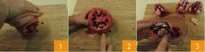 Para preparar o Moscow mule com romã, comece limpando a fruta. Remova a tampa cortando-a com uma faca de lâmina lisa. Gire a fruta sobre a tábua de corte sob suas mãos 1, assim a polpa amolecerá. Corte as 4 partes brancas e bem visíveis 2 e comece a desgranar a fruta. Com essa operação recém-concluída, deve ser mais fácil soltar as sementes. Recolha em uma tigela 3