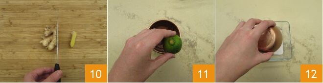 Decorrido o tempo, passe à decoração dos típicos copos para Moscow mule ou dos copos. Corte 4 fatias de gengibre e 4 de lima 10, com a outra metade do cítrico, umedeça a borda do copo esfregando a polpa na borda do copo 11. Em seguida, cristalize a borda mergulhando a parte umedecida no açúcar 12.