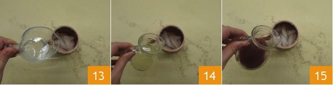 Preencha metade dos recipientes com gelo, e para cada um, despeje 45 gramas de vodka 13, 80 g de ginger beer 14 e ¼ do xarope de romã 15.