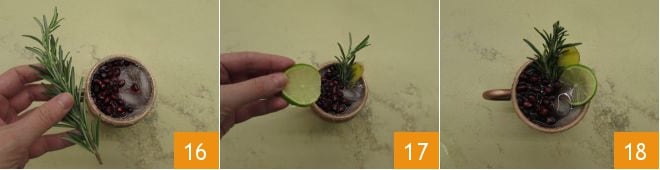 Misture bem e complete com 1 colher de sopa de sementes de romã, 1 ramo de alecrim 16, uma fatia de gengibre e uma de limão 17 e aí está pronto o seu Moscow mule com romã, agora é só saboreá-lo bem fresco 18.